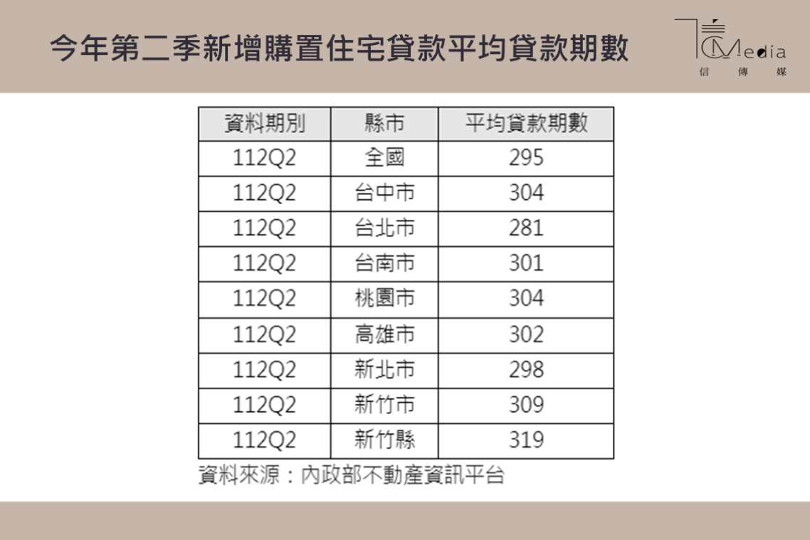 根據內政部不動產資訊平台資料顯示,國人購屋使用30年期房貸越來越普遍,今年第二季平均房貸期數已達295期,約為24.6年,創下歷史次高紀錄,10年之間,房貸期數平均就多了61期,相當於5年時間,在高房價的壓力之下,購屋人只能透過長年期的房貸減壓。