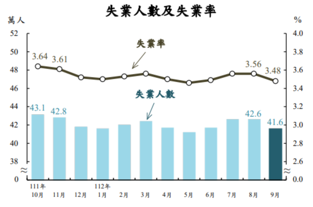 9 月失業人數為41萬6千人,較上月減少 1 萬人或 2.38%,主計總處國勢普查處副處長陳惠欣表示,主要因為應屆畢業生陸續找到工作,其中初次尋職失業者減少6千人,因工作場所業務緊縮或歇業而失業者也減了3千人。