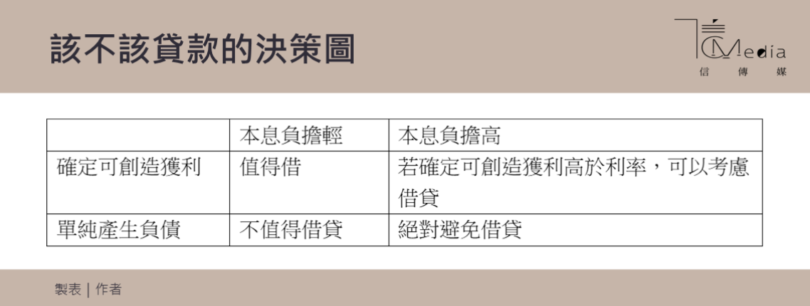 只不過,「要不要借學貸」的前提,並不單純只看「利率及門檻低」而已,反倒是該看「借款的本息負擔輕重」,以及「創造獲利與否」。也就是說,只有在「借款保證可以創造獲利」,以及「本息負擔輕(能夠承擔)」之際,才可以選擇借貸(請見下圖)。