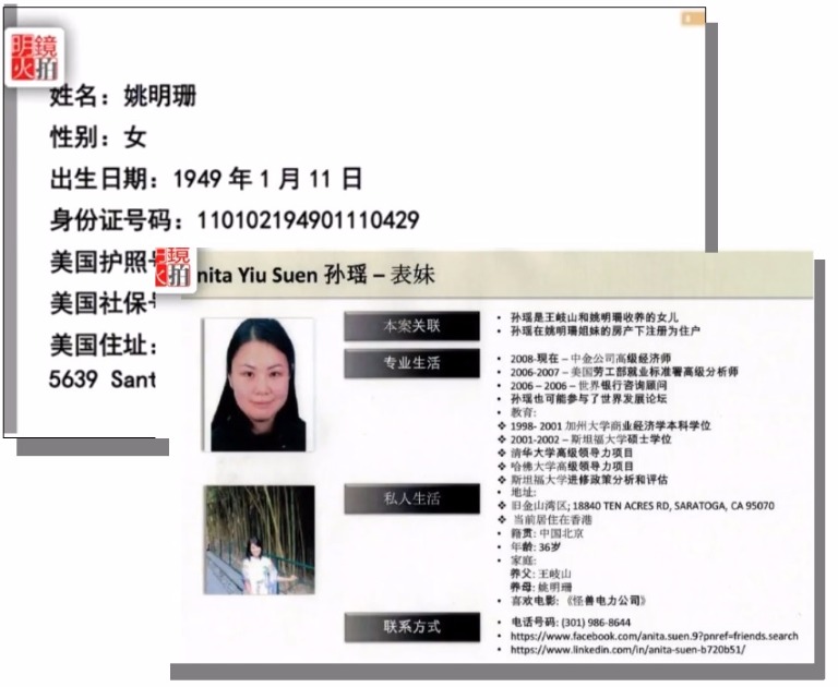 前面幾位都只是紙上資料,但接下來對王岐山與姚明珊的「養女」孫瑤(Anita Yiu Suen,36歲),郭文貴不但公布身分證號、房產,甚至還公布了她的照片,還把她最喜歡電影《怪獸電力公司》及聯絡電話都寫出來。「許多房產都是登記她名下,她具有繼承權,身價至少4萬億人民幣。」