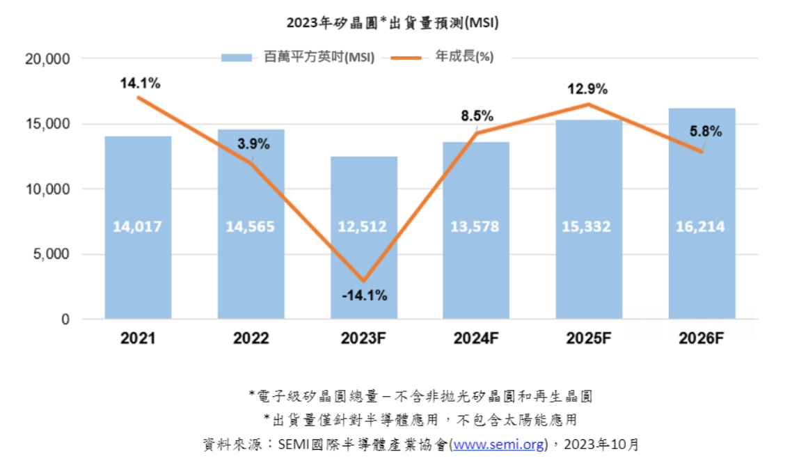 SEMI國際半導體產業協會公布年度矽晶圓出貨量預測報告指出,全球矽晶圓出貨量在2022年以14,565百萬平方英吋(million square inch, MSI)達歷史高點,預計2023年將下滑14%至12,512百萬平方英吋,隨後於晶圓和半導體需求復甦以及庫存量達正常水準後,出貨量將在2024年迎接成長反彈。