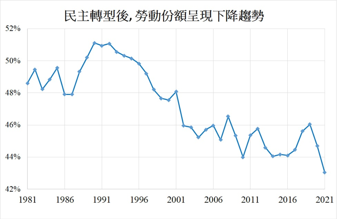 台灣年輕世代目前面臨低薪化與工作貧窮等生活問題,係因近三十來台灣勞動所得份額(labor income share,簡稱勞動份額)呈現下降趨勢(請參見下圖)。台灣勞動份額在解嚴後一度快速上升,並於1990年達到歷史新高。民主制度係透過以下管道確保勞工取得合理的所得份額。