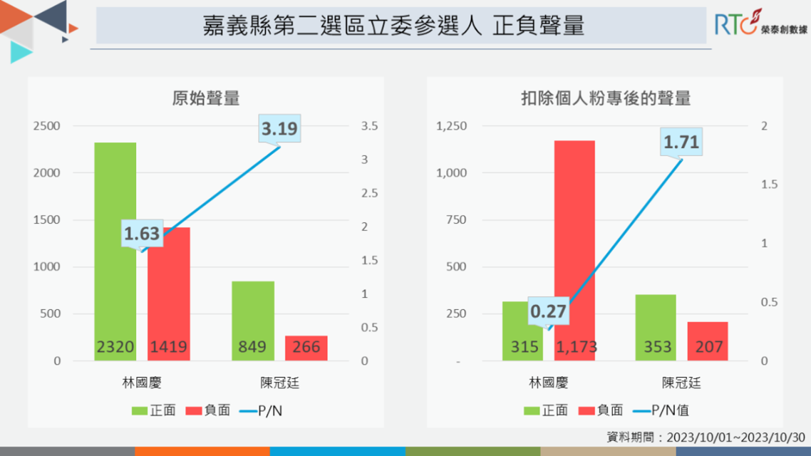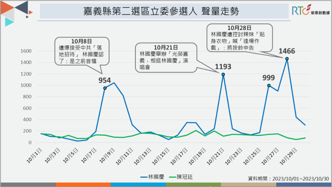 《榮泰創數據》分析兩位參選人10月以來的網路聲量,林國慶總聲量高達1.1萬則,聲量有多段明顯高峰,其中多與負面事件有關,包括接受中國落地招待且林國慶兒子還具中國「政協」身分,引發各界一片嘩然,以及傳出會館摟女索討內褲,失當言行引來網友撻伐,林國慶也反擊將按鈴申告。兩項爭議的曝光皆讓他的單日聲量飆升近1千則,且話題延燒不止1日。