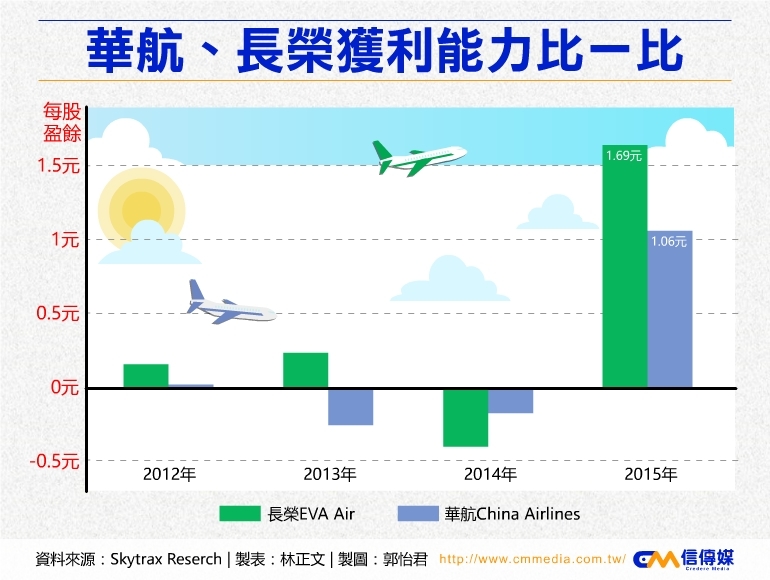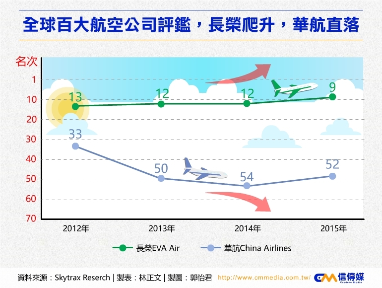 當華航勞資爭議僵局難解時,華航的「宿敵」──長榮航空正在慶祝獲得全球知名航空調查權威機構SKYTRAX RESEARCH評為五星級航空公司,長榮是全世界第8家、更是台灣第1家獲得此航空界最高榮譽的航空公司。這個獎項看在華航員工眼裡百般不是滋味,因為在SKYTRAX RESEARCH每年頒布的「全球百大航空公司」的評鑑中,長榮連續4年逐年上升,但華航卻年年滑落,早已掉出50名外。