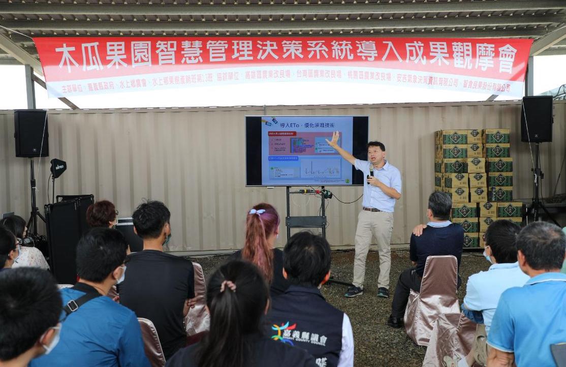 翁章梁分享一個案例。同一次颱風來襲,在一場傳統木瓜園,木瓜因為下雨浸水太久,導致落果損失慘重;而另一個在水上鄉種了12公頃的木瓜園,因為導入智慧農業的設備與系統,儘管有颱風來,他的損失也維持在最小,甚至因為有果可以採收而獲利。