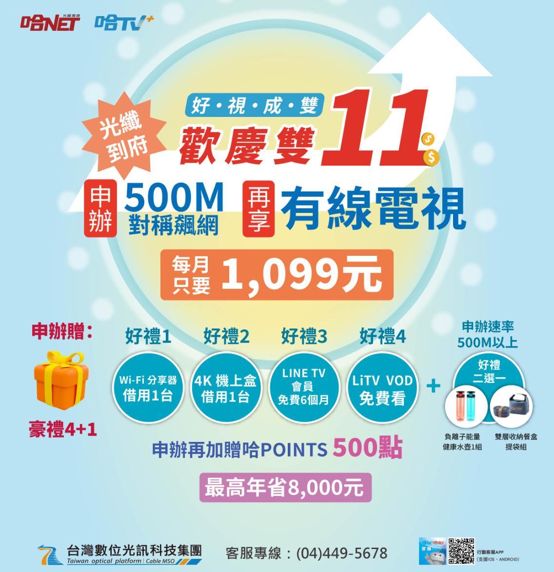 台數科雙11活動開跑,特別推出限時優惠,申辦「FTTH光纖500M對稱頻寬飆網+有線電視」方案,每月只要1,099元,還加贈4大好禮,現在申辦還有家用好禮二選一(負離子能量健康水壺1組或雙層收納餐盒提袋組),為回饋客戶,額外加碼贈送「哈POINTS」500點(1點=1元),最高1年可省8,000元。