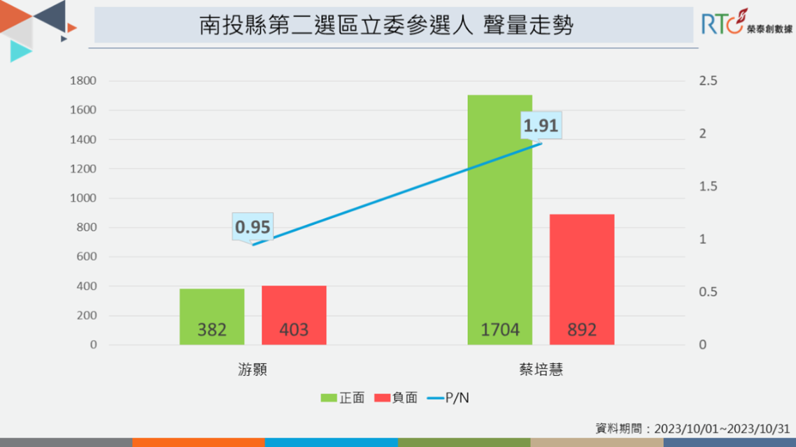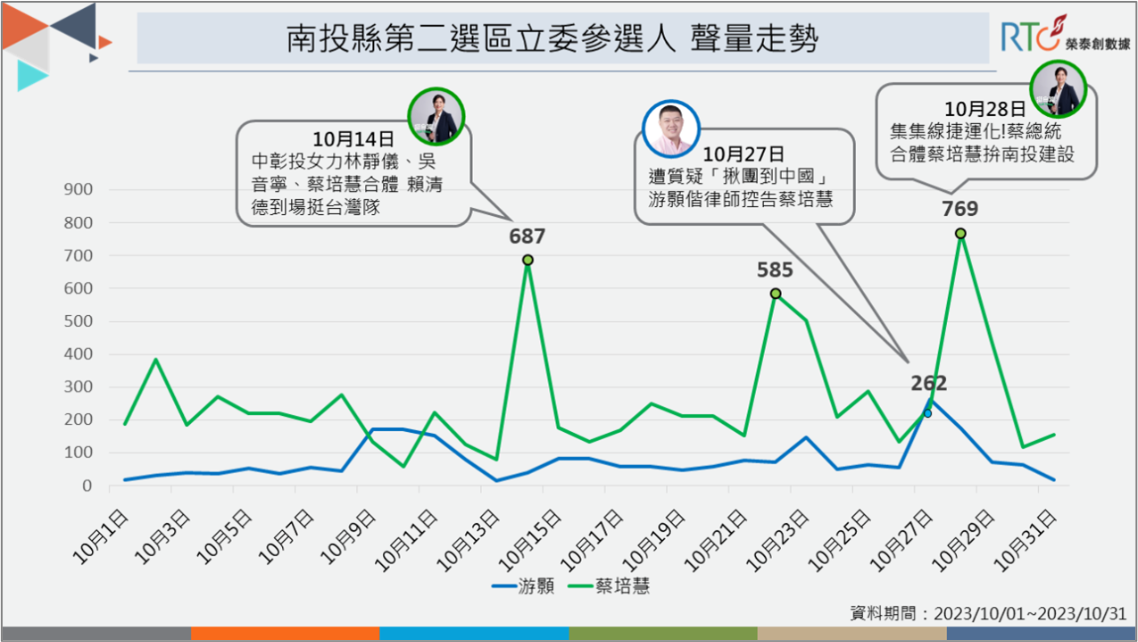《榮泰創數據》分析蔡培慧、游顥10月以來的網路聲量,蔡培慧在操作話題上具主動性,總聲量近8千則,其單日聲量幾乎都領先游顥,顯示游顥較不受到網友關注,話題熱度仍追趕不上蔡培慧。