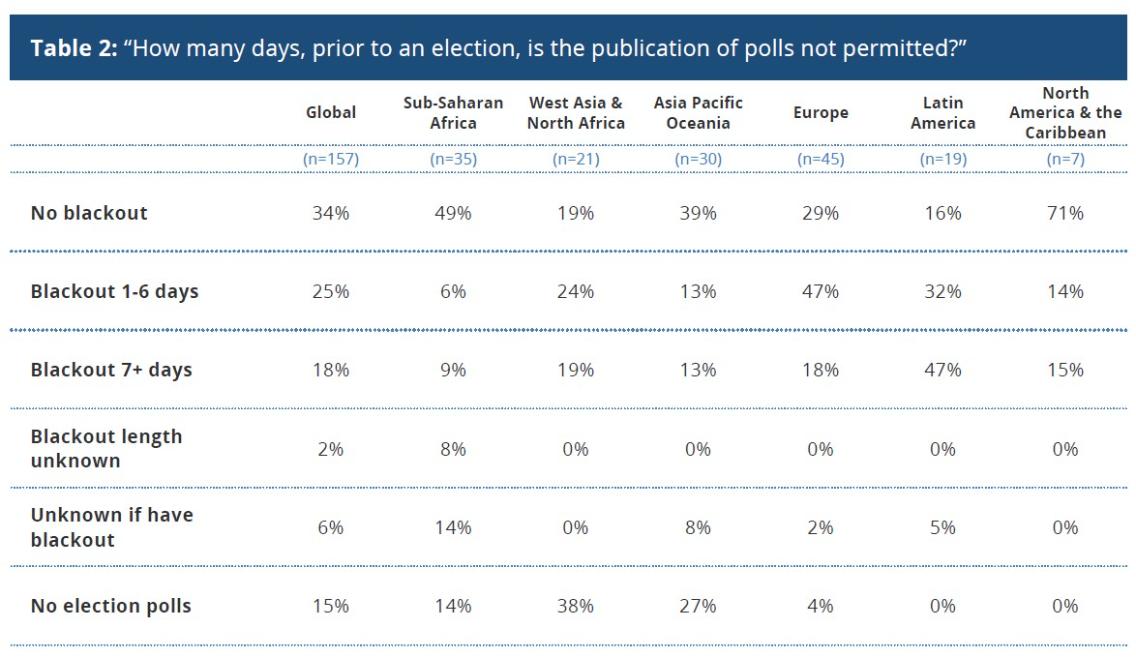 綜觀全球,在157個國家中,選前公布民調沒有限制的國家有34%、限制選前1到6天起不得公布民調的有25%,7天以上的有18%。即台灣的10天前規定,遠高於世界上6成的國家。無疑的,這份調查提到,在最接近選舉日進行的民意調查最接近選舉結果 。