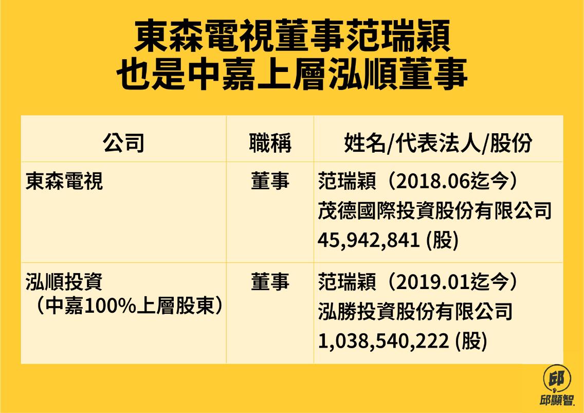 邱顯智說明,范瑞穎在茂德集團張高祥花了160億買下東森電視95%股權後,從2018年6月開始,擔任東森電視的董事。半年後,當中嘉取得交易許可後的2019年1月,范瑞穎也由泓順投資的上層泓勝投資指派,擔任泓順投資的法人董事。