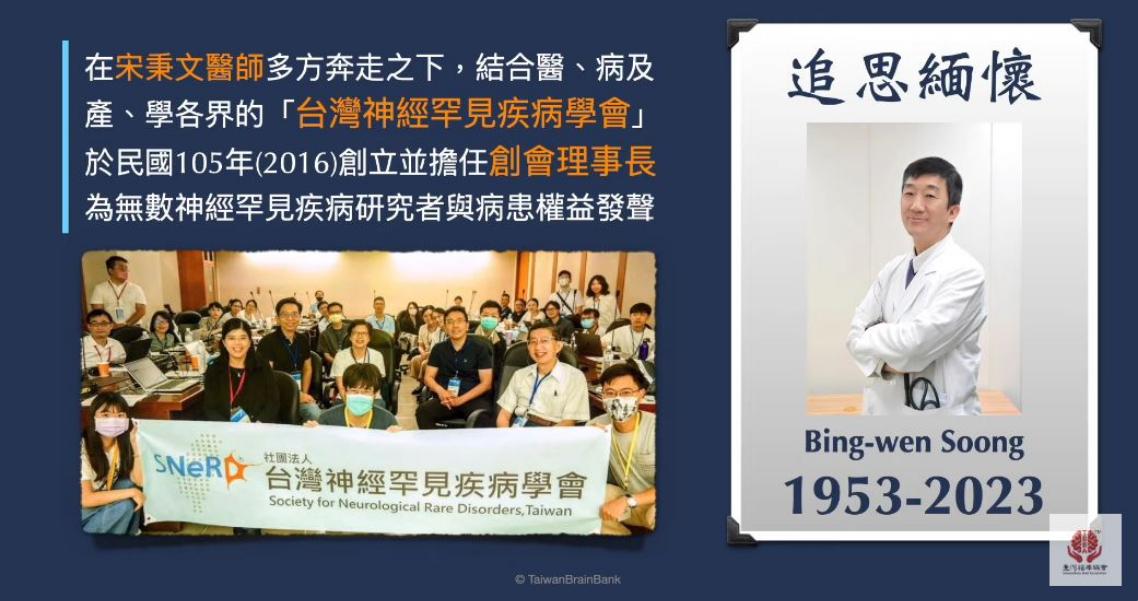 台灣腦庫協會也感念於1日剛逝世的台灣神經罕病權威、台灣神經罕見疾病學會創會理事長、台北榮總周邊神經科主治醫師兼科主任宋秉文,在多方奔走下,結合醫、病及產、學各界,為無數神經罕見疾病研究者與病患權益發聲。
