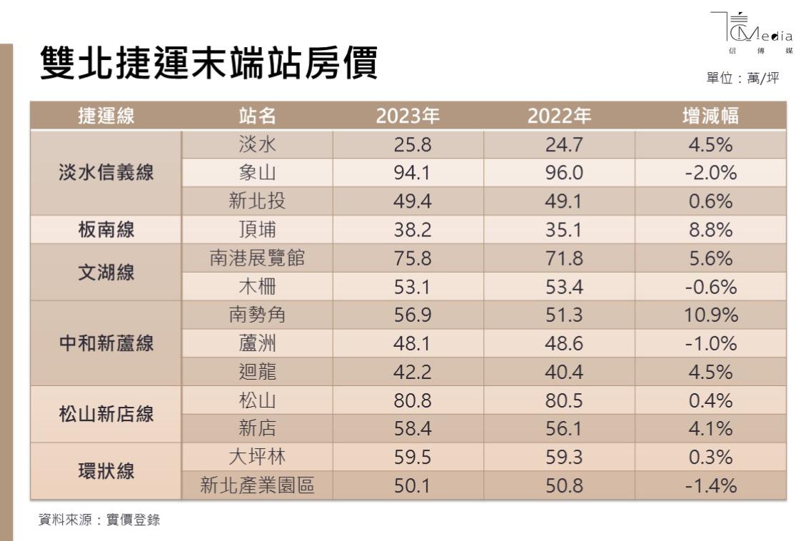 雙北通勤族倚重捷運系統,捷運站周邊是熱門購屋地點,許多民眾為了找沿線相對低價,會選擇往返市中心距離最遠的末端站,依據實價資料,雙北各條捷運線末端站還在2字頭的僅剩淡水站,而今年房價成長最多為南勢角站,成交均價56.9萬元、年增10.9%。大家房屋企劃研究室總監郎美囡分析,雙北捷運末端站雖然通勤時間較長,但生活機能大多完備,頗受自用買方青睞,尤其新北市價格相對低、大樓物件多的區域,價格能有發展空間。