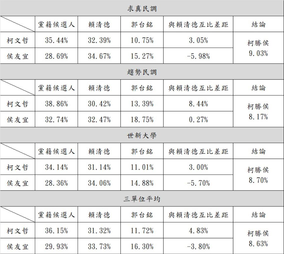 三家平均結果,「柯、賴、郭」分別是柯36.15%、賴31.32%、郭11.72%;「侯、賴、郭」則為侯29.93%、賴33.73%、郭16.30%。柯侯互比之下,柯勝侯8.63%。