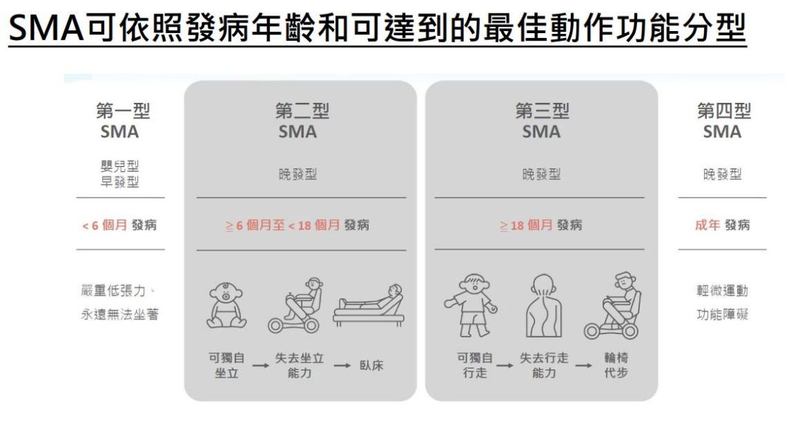 而SMA可依照發病年齡和可達到的最佳動作功能分4型,分別是: