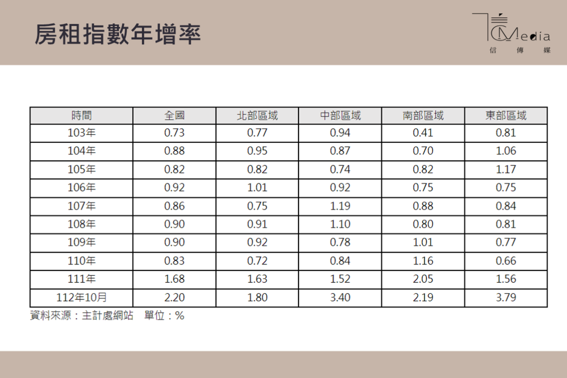 根據統計,全國的房租指數10月為104.56,年增率達到2.2%,不過區域間落差頗為明顯,北部地區可能房租基期較高,從4月開始房租指數年增率都不到2%,10月房租指數年增率北部為1.8%,但中部地區的10月房租指數年增率則高達3.4%,租金漲勢有加速的態勢,去年整年房租指數中部地區為1.52%,漲幅最高的則是東部地區的3.79%,顯示這波租金上揚已經不是集中在人口密集的北部地區,反而是大台北以外的區域補漲趨勢明顯。