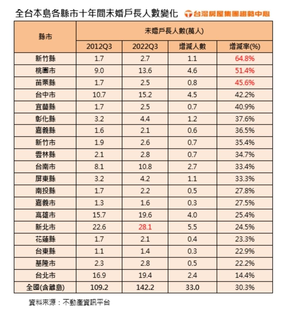 現代人晚婚,單身戶也越來越多,根據內政部不動產資訊平台最新資料,2022年Q3全國的未婚(不含離異、喪偶)戶長人數達142.2萬人,比十年前109.2萬人,足足多了33萬人,增幅30.3%;而各縣市當中,以新竹縣增幅最高,達64.8%,其次為桃園市51.4%,苗栗縣則以增加45.6%,躍居未婚戶長增幅最大的第三名縣市。