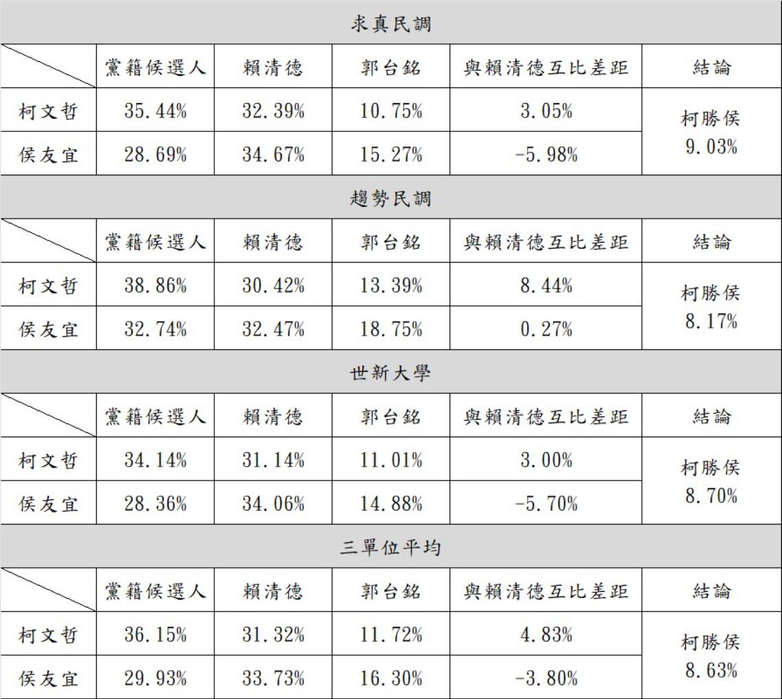 趨勢民調顯示,柯侯互比之下,柯勝侯8.17%。求真民調顯示,柯侯互比之下,柯勝侯9.03%。世新民調顯示,柯侯互比之下,柯勝侯8.70%。