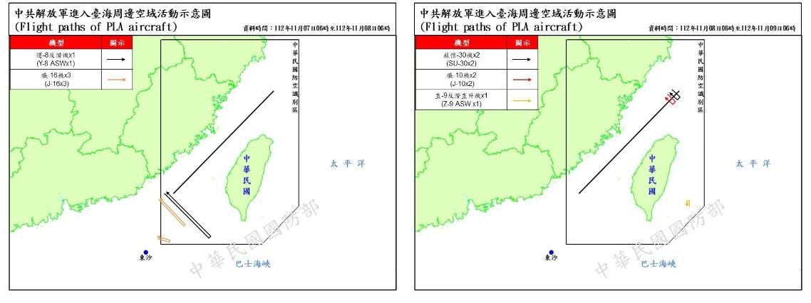 11月9日,國防部偵獲中共搭載衛星的長征運載火箭飛經台灣上空;8至9日中共航空母艦山東號沿台海中線以西,由南向北航行。