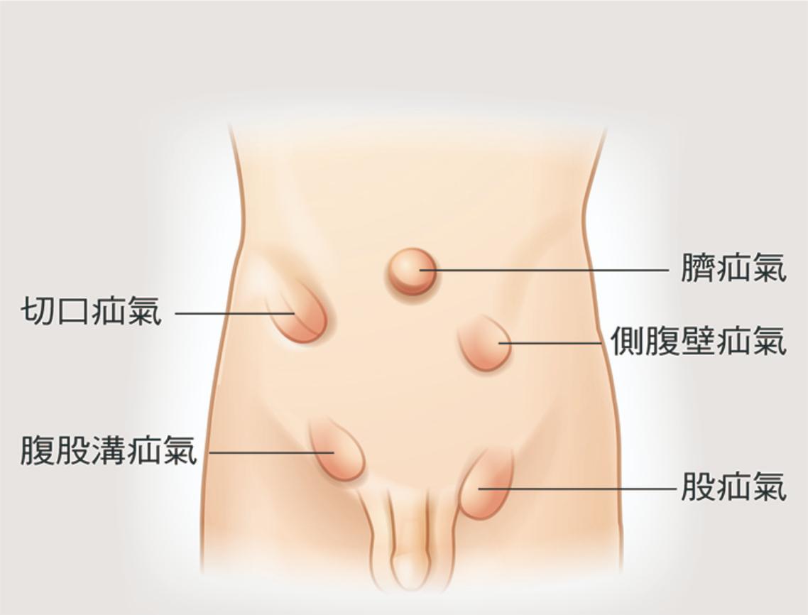 疝氣包含臍疝氣,切口疝氣,腹股溝疝氣等。