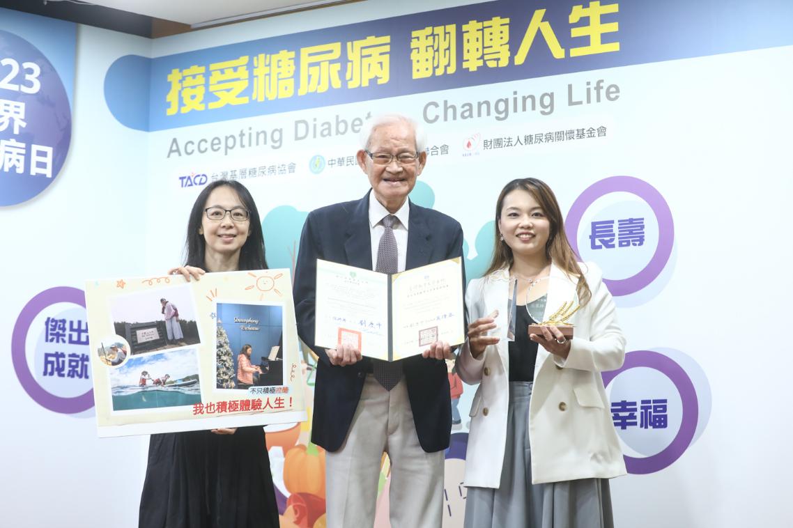 、劉祿德與張筑婷,分別以照顧者和病友的角色,獲頒抗醣勳章「幸福獎」、「長壽獎」與「傑出成就獎」。(台灣基層糖尿病協會提供).jpg)