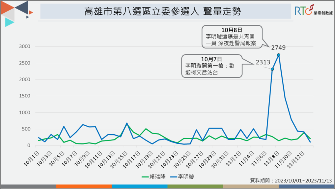 《榮泰創數據》分析兩位立委參選人近一個半月的網路聲量,李明璇以1.9萬則聲量遠超過賴瑞隆的1萬則,兩人聲量相差近2倍,李明璇雖有網路能見度,但其近期聲量高峰皆與她受到外界質疑有關。
