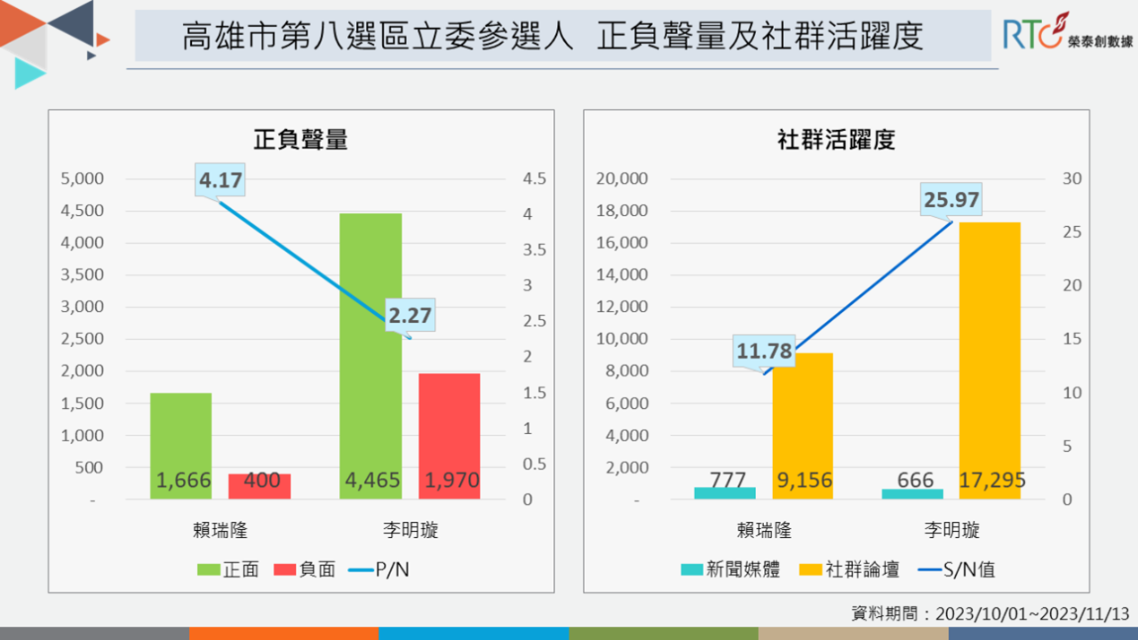 進一步比較兩人的網路好感度,賴瑞隆以4.17大幅超越李明璇的2.27。賴瑞隆好感度極高、正聲量是負聲量的4倍,靠著主打政績與現任優勢,在地方服務及國會問政均獲良好口碑,連續15個會期獲得公督盟評鑑為優秀立委,認真經營地方的表現有目共睹。