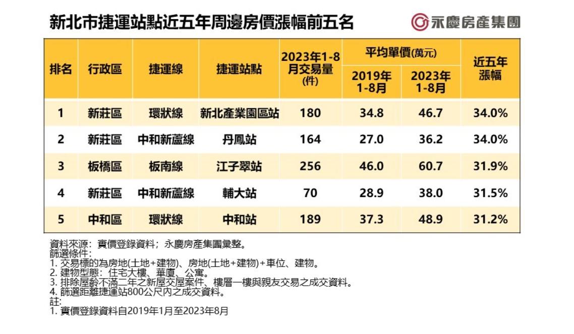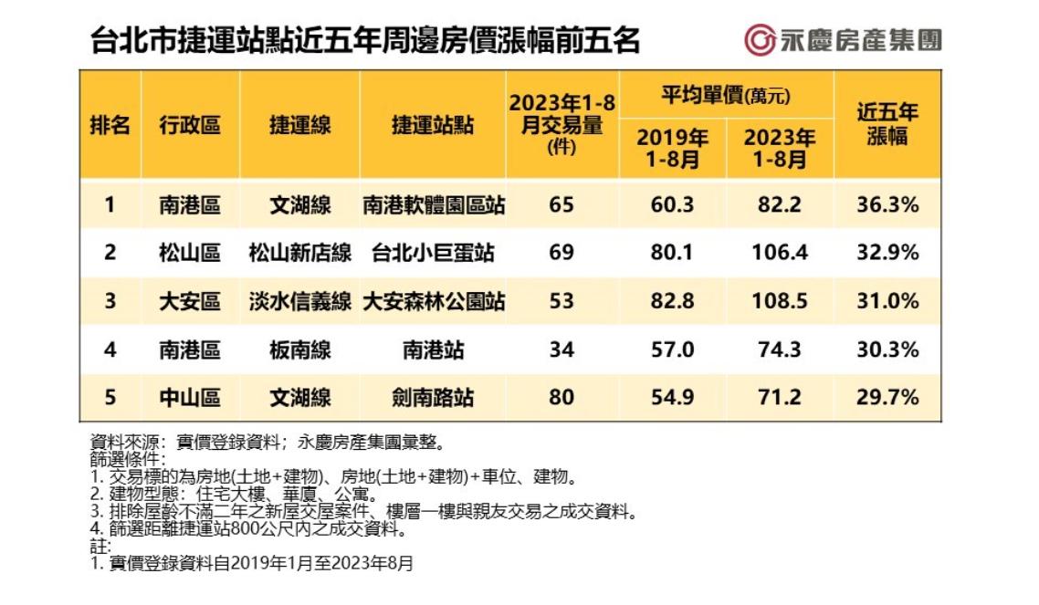 永慶房產集團根據實價登錄資料,分別統計台北市與新北市各捷運站點周邊房價五年漲幅前五名。其中,南港軟體園區站漲幅36.3%居冠,新北市則由新莊區的新北產業園區站及丹鳳站房價漲幅逾三成並列新北第一。