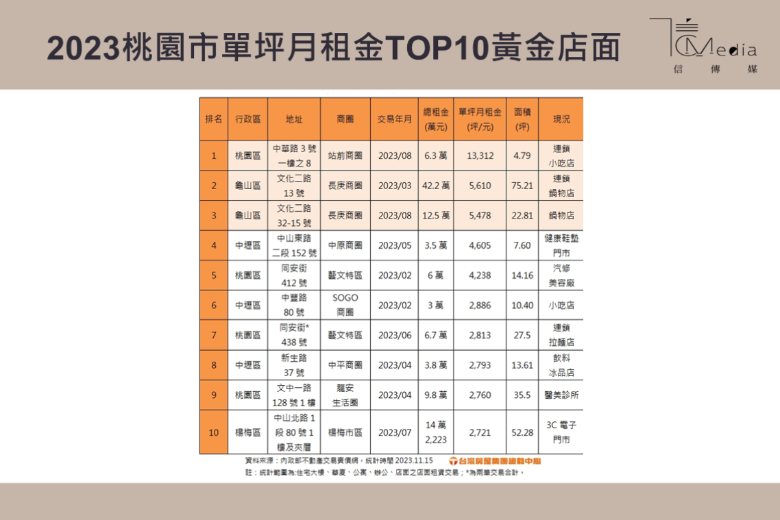 而去年桃園市的店租單價王,是龜山區大同路3.81坪大的豬腳攤店面,租金2.4萬,每坪租金6301元,兩相對照之下,更凸顯今年桃園站前店王的不俗身價。