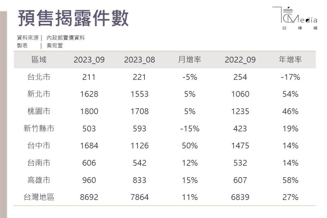 若以區域表現來看,9月預售案揭露件數最多的是桃園市,共揭露1800件,超越台中市的1684件與新北市的1628件,表現較悶的仍是台北市,揭露211件,主要台北市高單價與高總價的銷售速度放緩,單月成長較多的是台中市,較去年同期成長最多的則是高雄市的960件,可能與科技業投資確定後,市場買盤又重新回籠有關。
