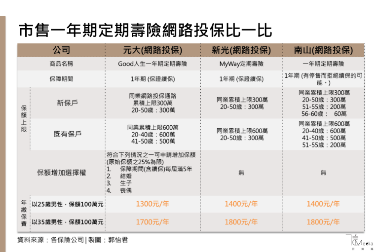 想要單獨購買一年期定期壽險最便利的管道是網路投保,目前有元大人壽、南山人壽、新光人壽三家業者。其中新光人壽與元大人壽都有的免審查即可享有保證續保的資格,但南山人壽一年期定期壽險可續保,卻有停售而拒絕續保的可能。在保費部分,元大人壽網路投保省去的傳統通路的佣金成本,直接將費用回饋給消費者。以25歲男性為例,保額一百萬元,元大人壽年繳保費僅需1300元(詳見下表)。