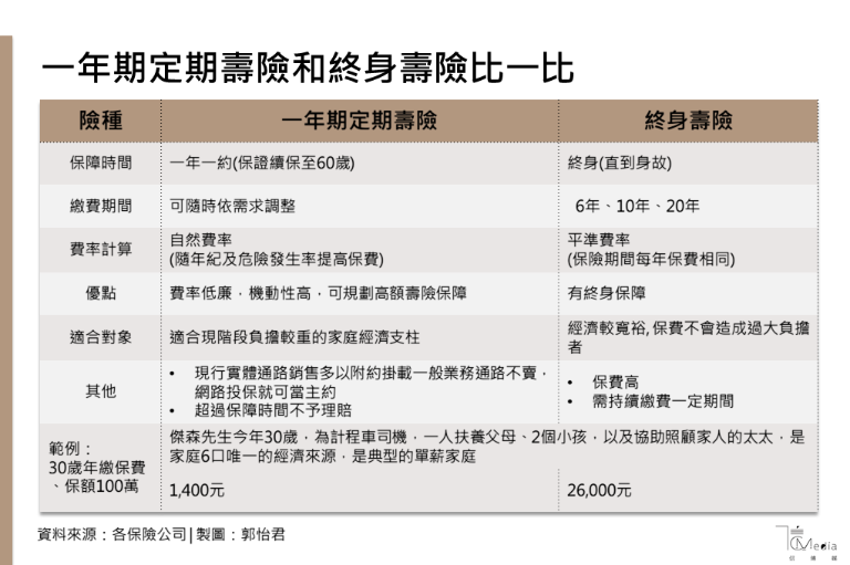 以同樣花費計算,終身險買的是「高保費的低保障」,定期險則是「低保費的高保障」。終身壽險的保費繳費期限從6到30 年不等,長期累積保費相當可觀。相較於一年一約、保費相對低廉的定期壽險,壽險顧問多半以「附約」方式,搭配高保費的長年期保單銷售,再加上壽險顧問從低保費商品取得佣金不多,因此單獨銷售一年期定期壽險意願不高,因此在壽險顧問推薦商品中難免看不到一年期定期壽險,讓消費者少了一種選擇性。