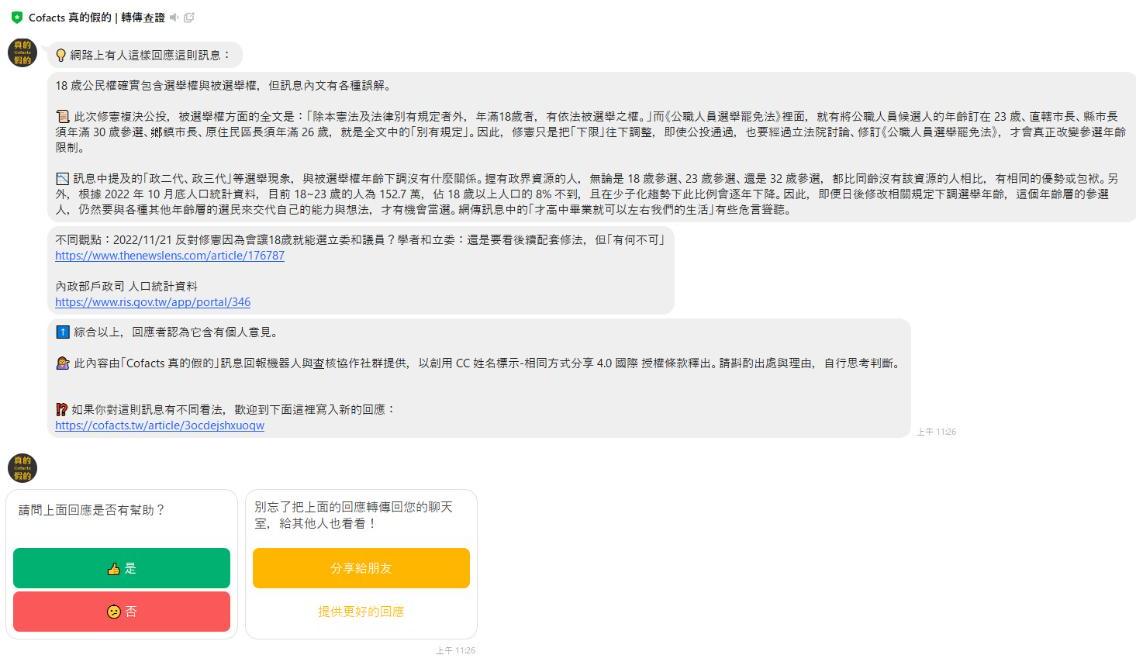 因此,自 2016 年起,公民科技社群 g0v 臺灣零時政府的成員推出「Cofacts 真的假的 – 訊息回報機器人與查證協作社群」,邀請民眾主動回報在 LINE 上發現的可疑訊息,再由來自各領域的編輯志工進行事實查核,撰寫有助判斷訊息真假的回應。之後只要有民眾發出相似問題,機器人便會從資料庫中找出相關回應供民眾參考。收到回應的民眾如有不同看法,也可以補充新的回應。