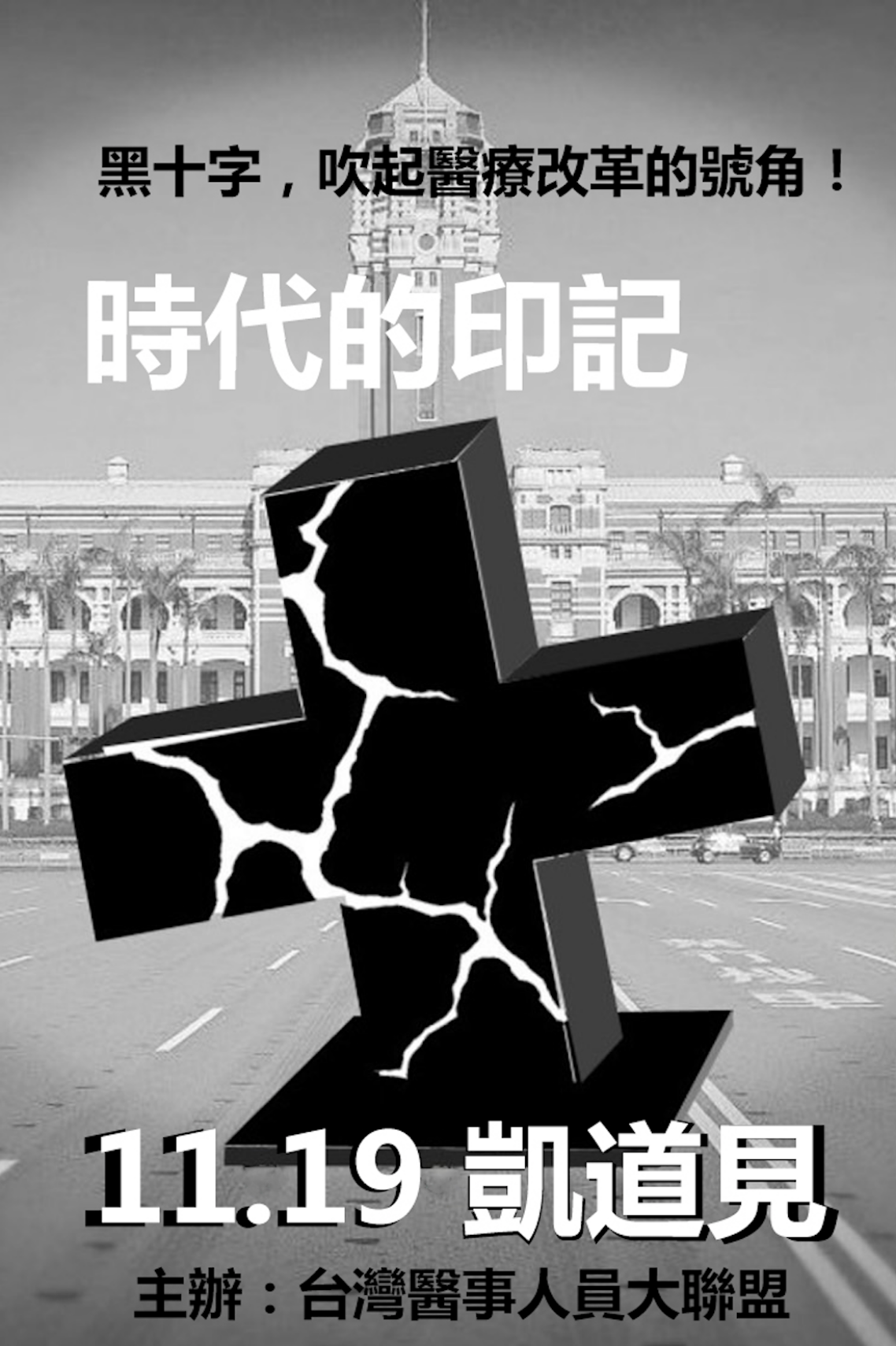包含西醫、中醫、護理師等醫事團體15日宣布組成「台灣醫事人員大聯盟」,並宣布11月19日在凱道進行「黑十字運動」,來自基層的醫中牙藥護師和學生們,將在凱道上扛起黑色大型十字架、唱起黑十字之歌,表達對台灣醫療的擔憂與改革的期待,要求政府重視「醫事人員總量管制原則」。