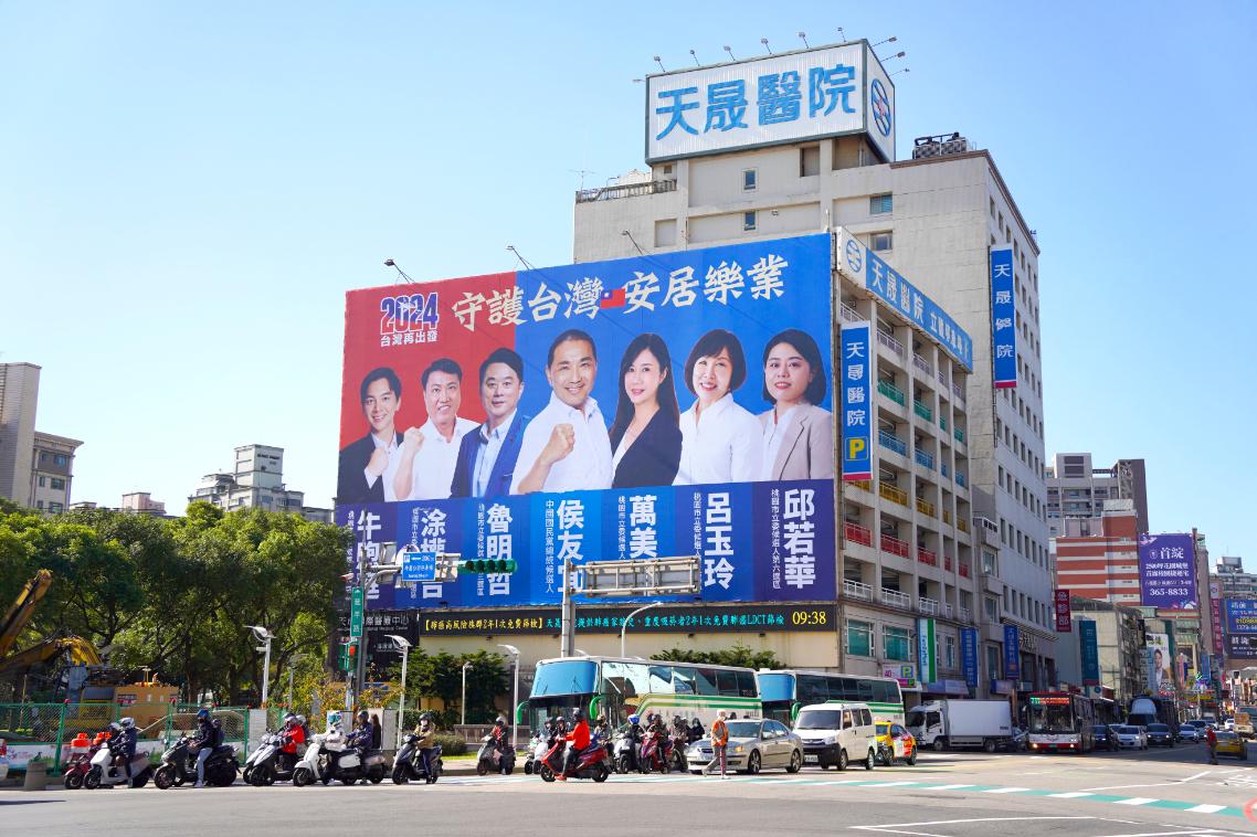為了輔選,張育美贊助侯友宜總統候選人和桃園市六位立委候選人一塊大看板,地點就選在中壢地區最醒目看板點、號稱桃園市最大户外廣告的天晟醫院外牆,正巧今天就是上架的第一天。