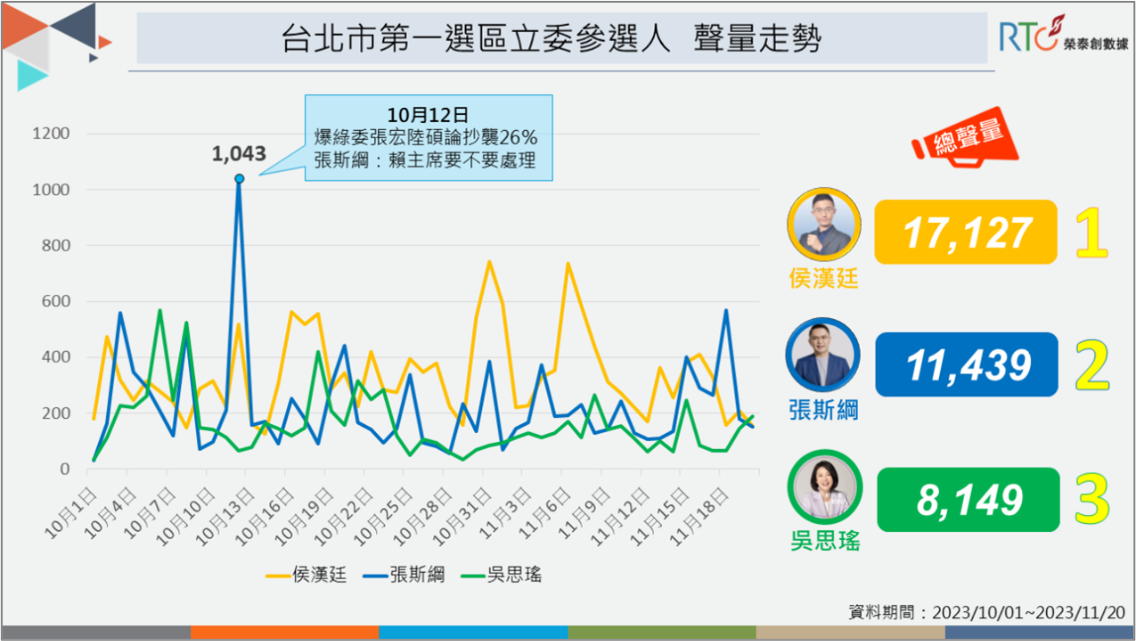 戰鬥藍的張斯綱總聲量達1.1萬則,秉持敢「戰」、揭弊制衡的精神,頻頻對綠營重砲攻擊,其中10月12日指控民進黨立委張宏陸論文涉抄襲,並點名民進黨總統參選人賴清德「你要不要處理?」,引起藍綠正面交鋒,單日聲量破千則。在泛藍陷入整合難題,「作壁上觀」的吳思瑤總聲量達8千則,討論度明顯低於其他兩人,與侯漢廷聲量更差距2倍。