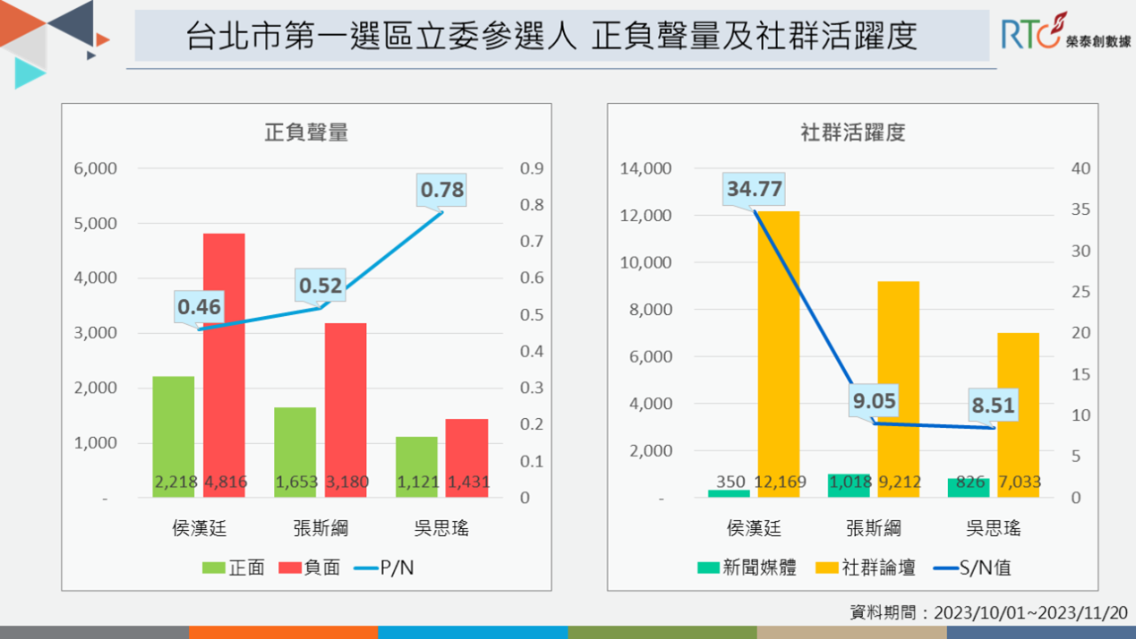 以社群活躍度而言,新聞媒體焦點多集中在張斯綱與吳思瑤身上,因其政黨資源較為豐沛,相較侯漢廷來自小黨,新聞聲量明顯低於三人、僅350則,不過他口才便給,在政論節目中相當活躍,且著重社群經營,為此在社群平台上帶來大量熱絡回應,社群活躍度輾壓其他兩位競爭者。