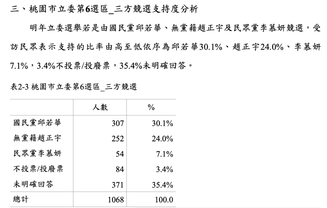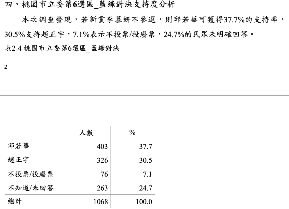 該人士並秀出11月中旬最新的內參民調,明年立委選舉若是由邱若華、趙正宇及民眾黨李慕妍競選,支持度由高至低,仍依序為邱若華30.1%、趙正宇24.0%、李慕妍7.1%;同份民調也指出,若李慕妍不參選,邱若華可獲37.7%支持度、30.5%支持趙正宇,邱若華呈現穩定領先。