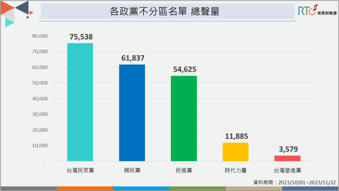 《榮泰創數據》分析10月1日至11月22日之間,各政黨不分區名單的討論聲量,相比其他政黨較晚才公布名單的民眾黨,推出「最強戰力,超越藍綠」的代表,由前台北市副市長黃珊珊與前立委黃國昌「雙黃領軍」,「戰狼小姐姐」發言人陳智菡也被列入其中,不分區人選獲得最多關注,總聲量高達7.5萬則。