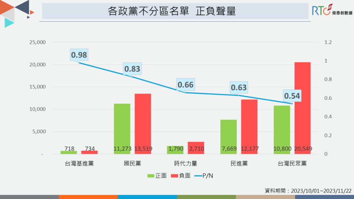 民眾黨網路聲量雖穩居第一,但實際負聲量是正聲量近2倍,好感度敬陪末座。外界普遍認為民眾黨整體名單較上屆黯淡無光,有許多人選過去都曾是其他政黨成員,讓人感受不到政黨價值與理念,更遭網酸是「失意政客聯盟」、「跳槽專業戶」,名單備受議論,大眾難以買單。