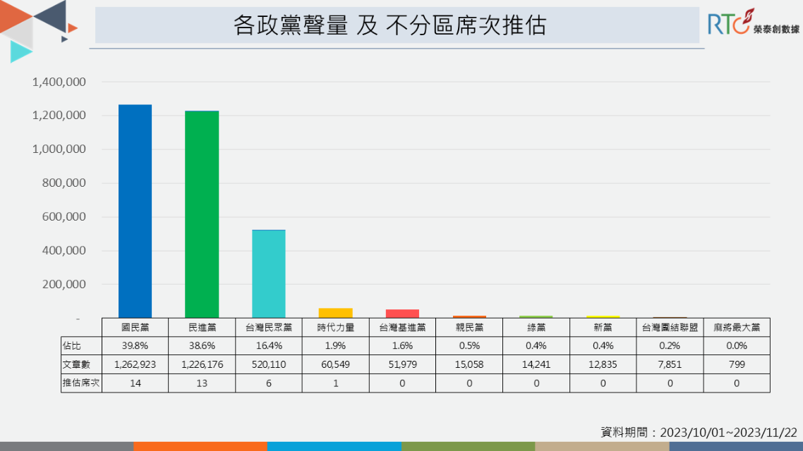 雖然民眾黨不分區討論聲量最高,但根據各政黨在網路獲得的聲量來推估可能的不分區席次,國、民兩大黨皆有超過120萬則聲量,其中又以國民黨聲量佔據第一,預測席次為14席、民進黨13席。