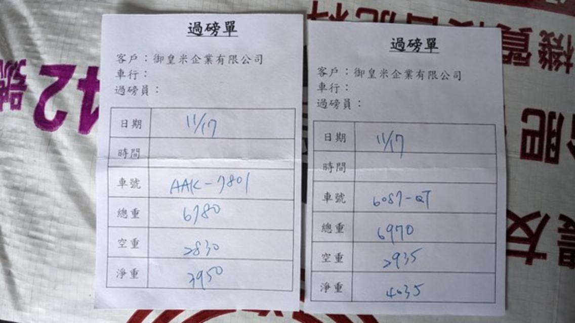 果然颱風過後,強風、淹水造成稻熱病,空包彈(沒有結實的稻穗)就很多,陳里長的這塊田,相較其他的田區從表面上看來也差不多,11月17日收割前還相當忐忑,是否會有好的結果。開始收割,發現似乎穀子的體積比較大,經過2個小時的收割,送了兩車穀子去稱,結果一車3950公斤,一車4035公斤,加起來超過8000公斤;烘完穀有9個太空包,送到屏東新園鄉的新豐碾米廠,總重5937公斤,這也就是1萬台斤。