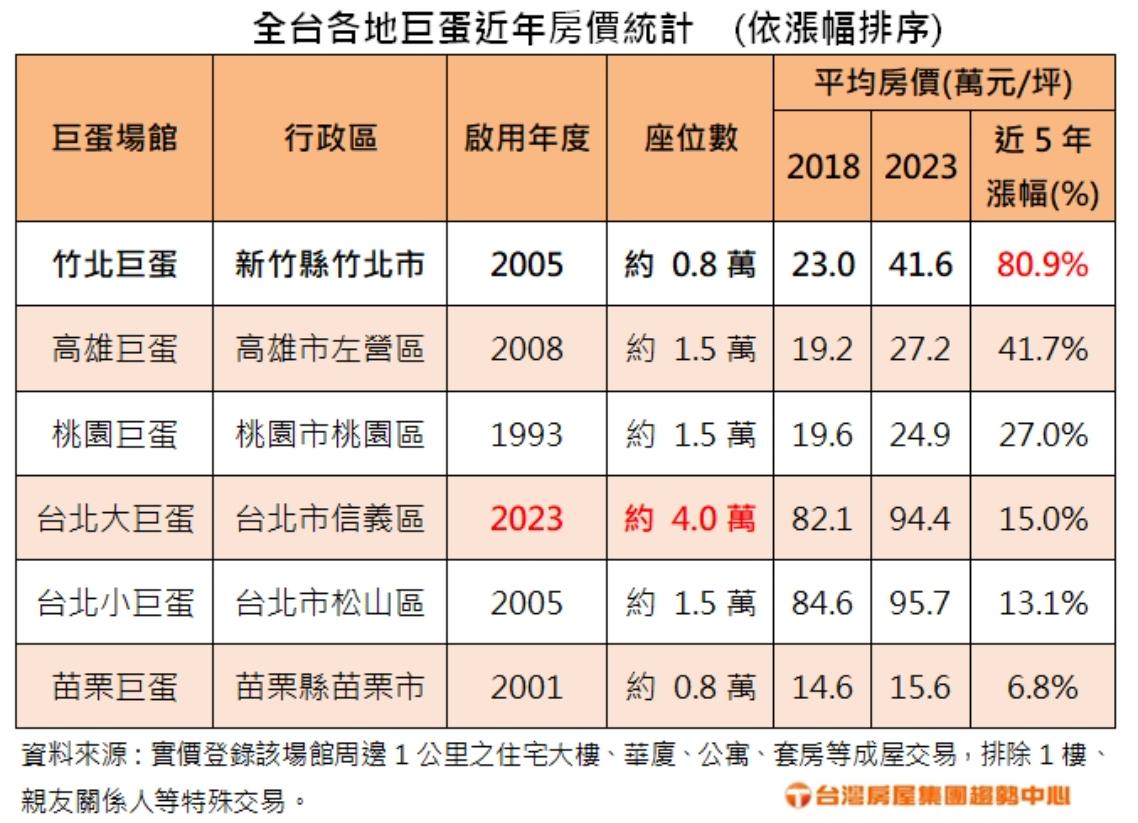 亞洲棒球錦標賽將於12月3日在台北大巨蛋正式開打,門票也將於本周六開賣,眾所期待的巨蛋場館是否能帶來人潮和房市錢潮?台灣房屋根據實價登錄資料,統計全台六大巨蛋近五年周邊房價漲幅,結果全面收紅!其中「竹北巨蛋」今年單價達41.6萬元,較2018年的23萬元成長約8成,漲幅高居第一!近期頻頻舉辦大咖演唱會的高雄巨蛋則奪下亞軍,近五年房價上漲了41.7%;國內第一座巨蛋場館的桃園巨蛋,亦以近3成漲幅位居第三;即將啟用的台北大巨蛋,房價也響起漲聲,今年均價與2018年相比提升了15%,名列第四。