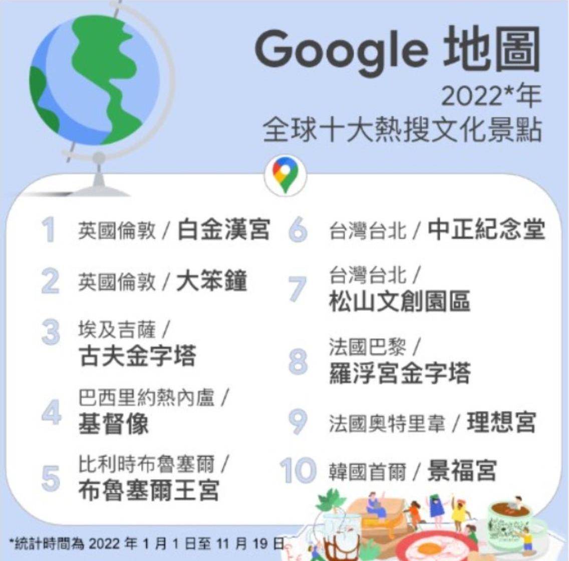 在「Google地圖全球十大熱搜文化景點排行榜」中,中正紀念堂及松山文創園區榜上有名。(資料來源/Google台灣官方部落格)