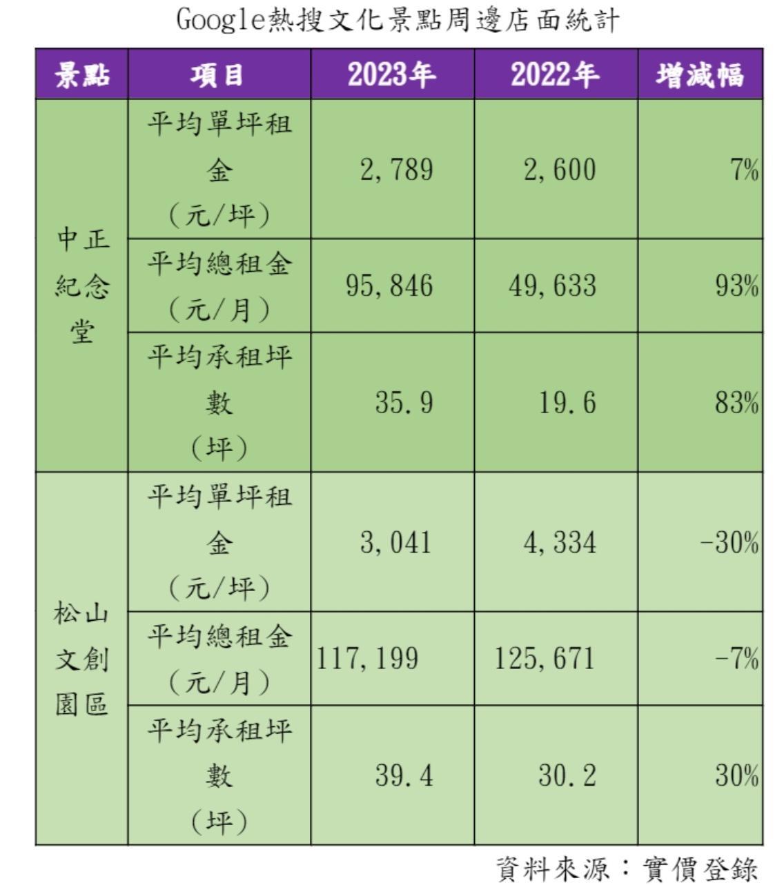 依據實價資料,中正紀念堂周邊店面的平均單坪租金及平均承租面積都有顯著成長,今年平均承租面積大幅增加83%,平均單坪租金年增7%,松山文創園區今年周邊店面承租面積也提高30%,但租金卻下滑30%。大家房屋企劃研究室總監郎美囡分析,觀光、消費人數增加,店家進駐商圈及承租大面積店面的意願提高,中正紀念堂周邊租金不高,故有提升的空間,松山文創先前因一旁的大巨蛋即將啟用,在去年之前已有店家提早布局,今年低單價的租賃較多,因此拉低平均店租。