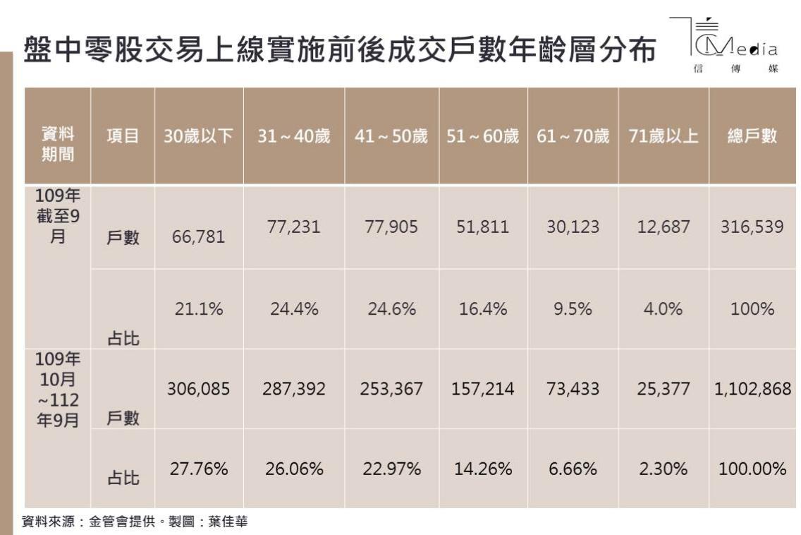 根據金管會統計,自盤中零股交易制度上線以來,截至今(2023)年9月底為止,上市零股成交戶數由約32萬戶成長至110萬戶,零股交易成交戶數大幅成長約248%;其中30歲以下年輕族群成長幅度最大,占比由21.1%成長至27.76%,顯示年輕人對證券市場已有相當的參與度。