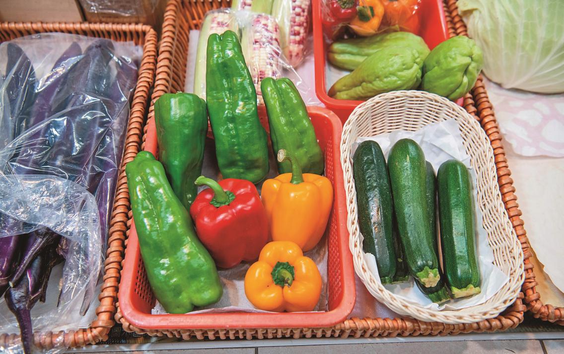 來到位於轉角的「三日蔬果行」,各種新鮮蔬果整齊陳列於籃中,攤位側邊的冷凍櫃則另有海鮮展售。老闆娘陳小姐表示,海鮮都是一上岸便急速冷凍的新鮮漁貨,「因應現代人消費習慣的改變,我們也採複合式經營,蔬果、海鮮一站購得,藉此吸引更多顧客上門。」一旁的徐民勳則被攤位上不甚起眼、表層帶點土的塊莖蔬菜吸引,他介紹道:「這是小里芋,口感較一般芋頭更綿密細緻,很適合搭配肉類或海鮮等烤物一同品嘗,烤後酥脆的滋味令人驚喜。」陳小姐也補充,秋、冬是小里芋的產季,燉煮後入口會有股清香,偏好這味的顧客著實不少。