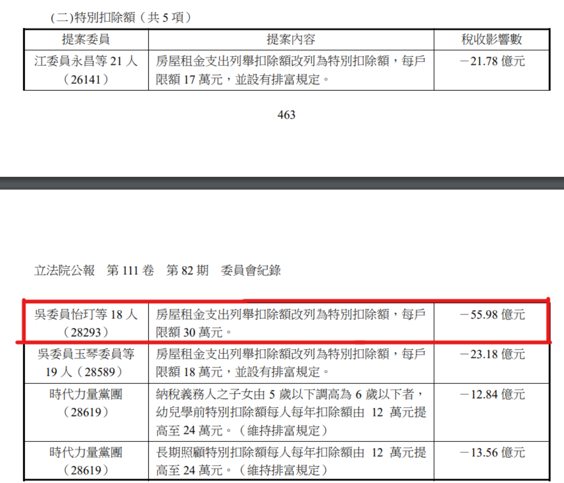 有趣的是,財政部長期以「稅損數十億」等理由反對修法改革租金抵稅制度,在111年表示「特扣30萬」將稅損55.98億,今(112)年卻說「恐達一百億元」。
