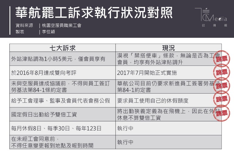去年華航罷工之所以順利落幕,是因為華航董事長何煖軒答應七項訴求,分別是「不得更改會員現行報到地點及工作時間計算方式」、「反勞基法第84-1條」、「保障年休123天,月休8天、每季休假30天」、「外站津貼每小時5美元,且非本會會員不得享有」、「國定假日出勤雙倍工資」、「實施雙向考評」、「給予工會代表、理事、監事會務假」,目前僅有部分履行,甚至有每況愈下的情形。