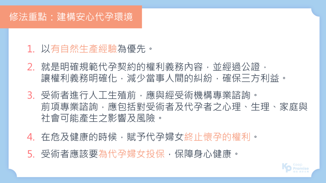 此外,代孕者部分,吳欣盈表示,代孕者、人工生殖子女,以及受術者三方的權益都應予以重視,代孕以「互助」為原則,並同時保障代孕者其身體自主權、隱私權及相關權益,身為衛環委員召委,吳欣盈表示,已提出自己的「人工生殖法」版本,並將在下星期排審。