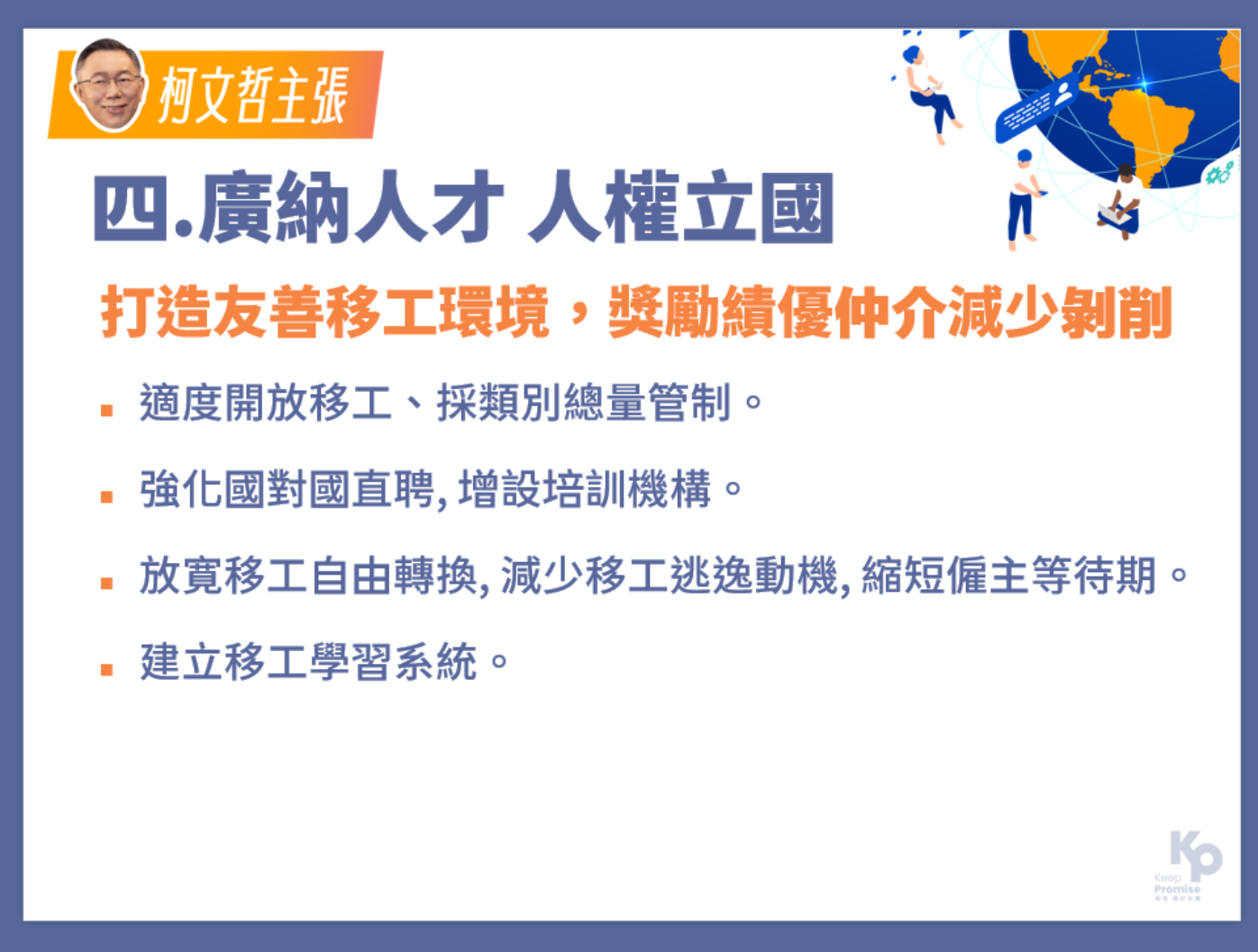 針對移工,柯文哲短期規劃要降低「移工留才久用方案」的留用年限與門檻,開放符合資格的移工主動申請在台永居;中長期則訂定足以吸引移工留台的《新經濟移民法》,吸納國際人才。
