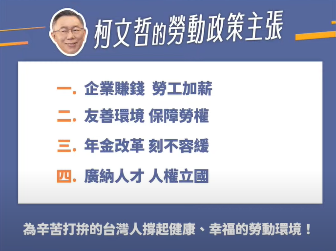 民眾黨總統候選人柯文哲今(5)日召開「共創優質勞動環境」勞動政策記者會,用4大綱領為基石,希望為辛苦打拚的台灣人撐起健康、幸福的勞動環境,爭取選民支持。